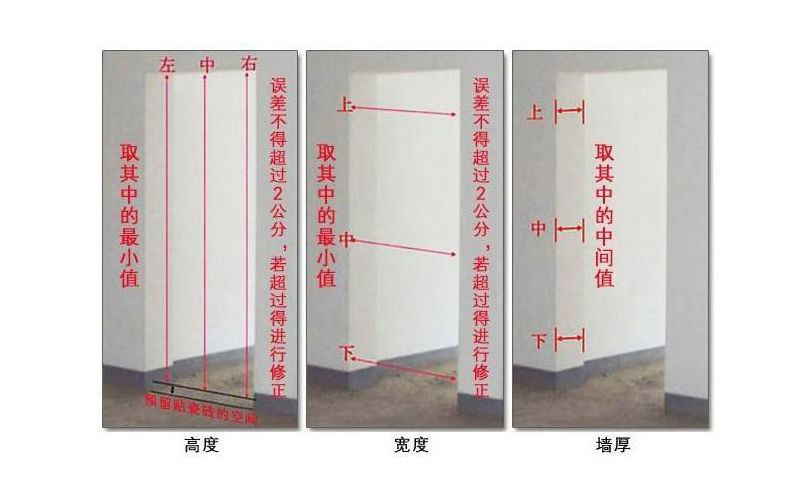 厚度:這里的厚度指的是測量墻體的厚度,對墻體厚度水平進行測量,選取5個以上的測量點,以最大值做為墻體的厚度值,若墻面要裝修的,那么門洞墻體厚度則需附加裝修材料的厚度。